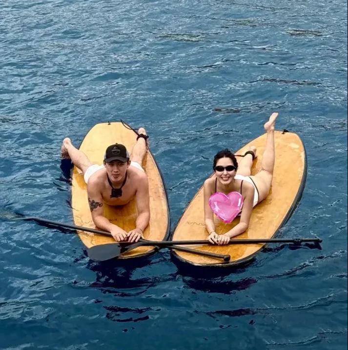 随后她又晒出两人划水的图片,在浩瀚的大海中两片轻舟紧紧挨着,两人望向镜头,这一刻很是甜蜜。两人颜值方面还真是挺般配,虽说是,杨采钰比张向荣还大两岁,但是杨采钰一直保养的很好,根本看不出来已经30多岁。而且她体质是真好哇,一般情况下女性生完孩子都会保养一段期间,而她已经开始大胆的玩儿水了。