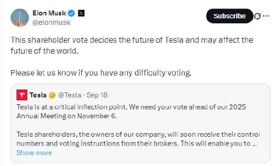 特斯拉在帖子中写道:“特斯拉正处于关键转折点。在2025年11月6日年度会议召开前,我们需要您的投票支持。特斯拉股东作为公司所有者,很快将从券商处收到控制代码及投票指引,以便您参与投票。我们恳请您针对所有提案,均按照董事会的建议进行投票。”