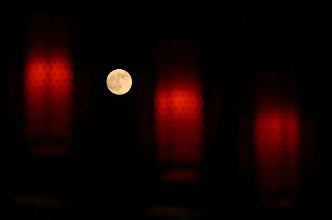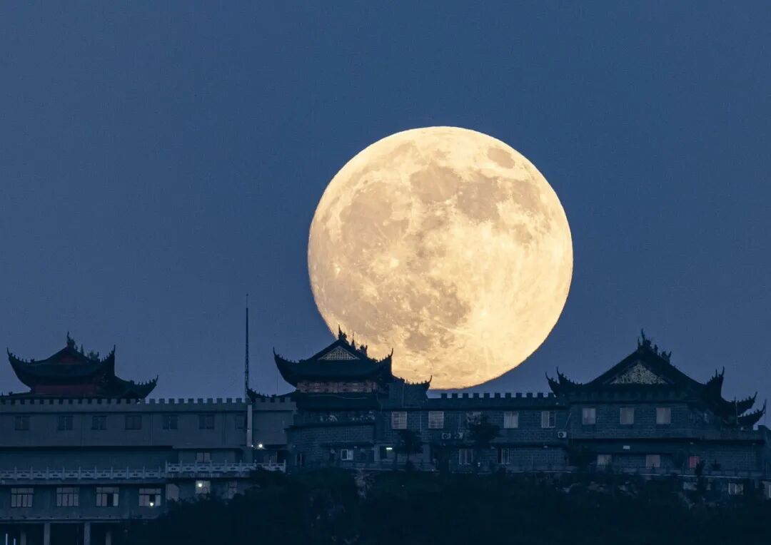 10月6日在浙江省温州市苍南县炎亭镇拍摄的中秋圆月。 新华社发(苏巧将摄)