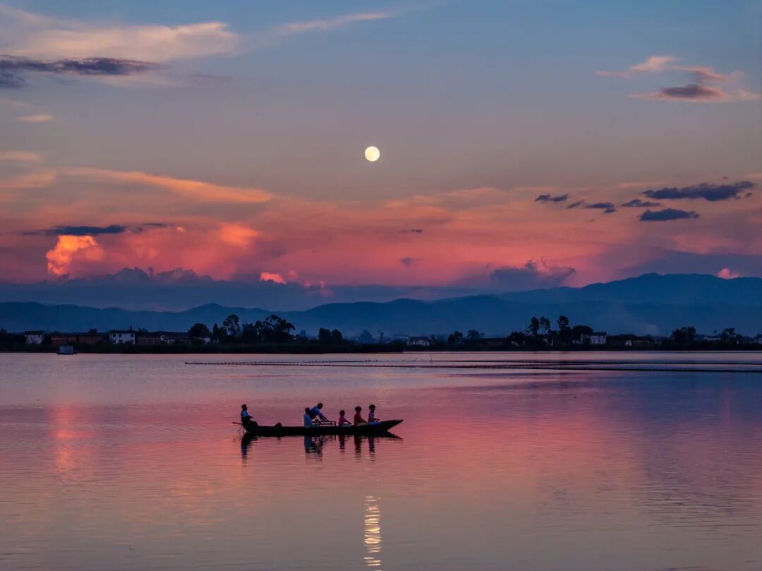 10月6日,人们乘船在云南大理洱源西湖赏月(无人机照片)。 新华社发(罗新才摄)