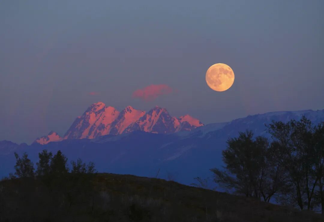 10月6日在新疆乌鲁木齐拍摄的天山山脉上空的中秋圆月。新华社记者 徐宏岩 摄