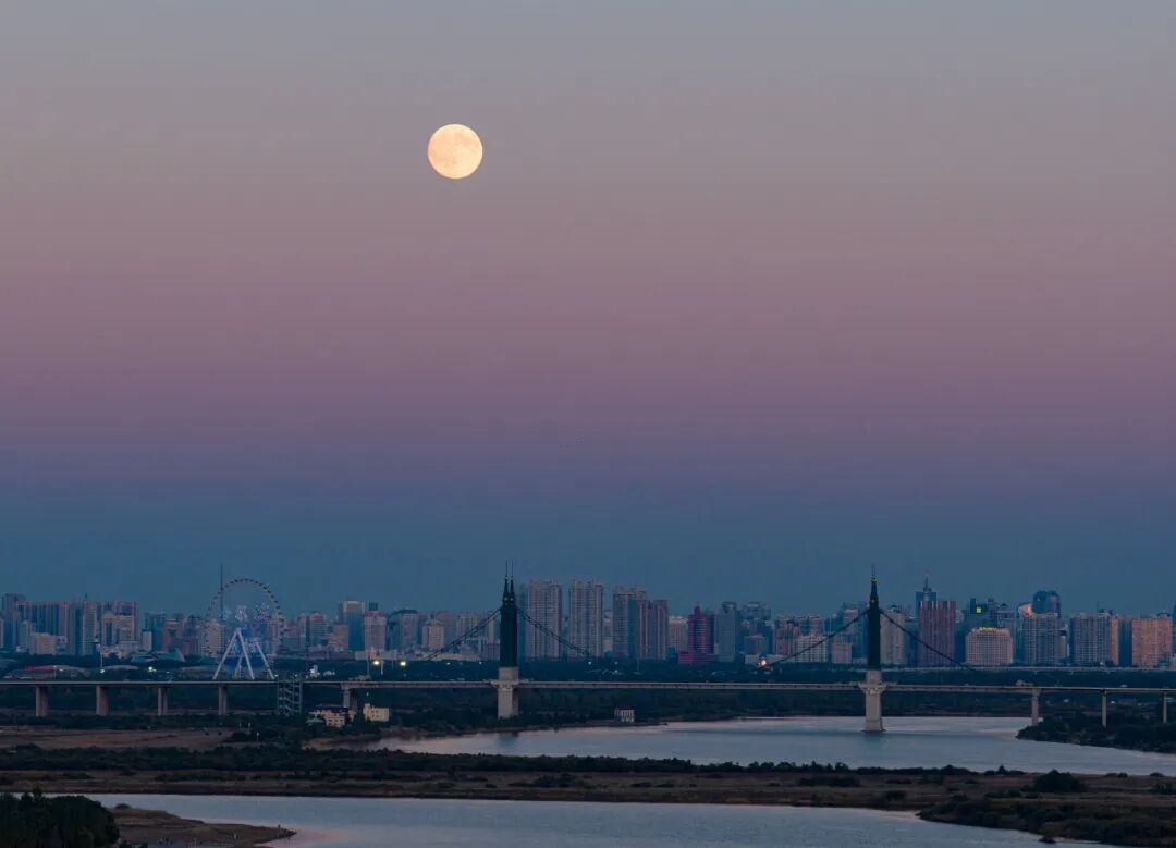 10月6日在黑龙江省哈尔滨市拍摄的中秋满月(无人机照片)。 新华社发(刘大鹏摄)