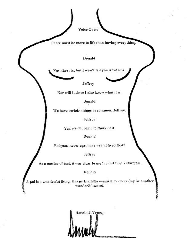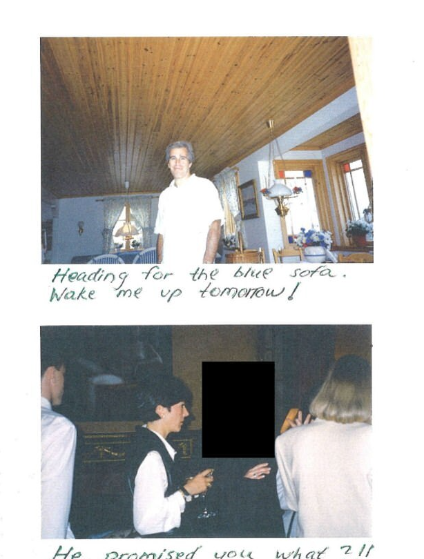 照片中,同样赤身裸体的爱泼斯坦双手抱住麦克斯韦,并将头靠在她的脖颈处,这张照片被收录在他50岁生日纪念册中。该纪念册由麦克斯韦于2003年编纂,她在照片上手写留言:“生日快乐,亲爱的,吉丝兰。”